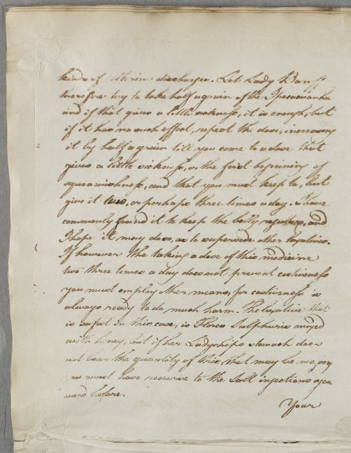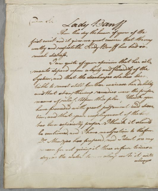 | Summary | Reply [to dr Alexander Abernethie] concerning the case of 'the very worthy and respectable Lady Banff'. |