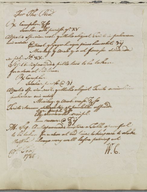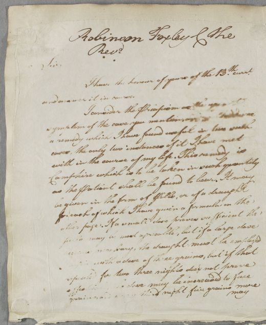 | Summary | Reply to Robinson Foxley concerning an unnamed patient, 'the Revd.', who suffers from priapism. Cullen advises the use of camphor, and encloses prescriptions. |