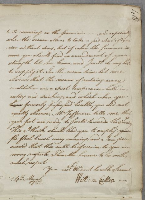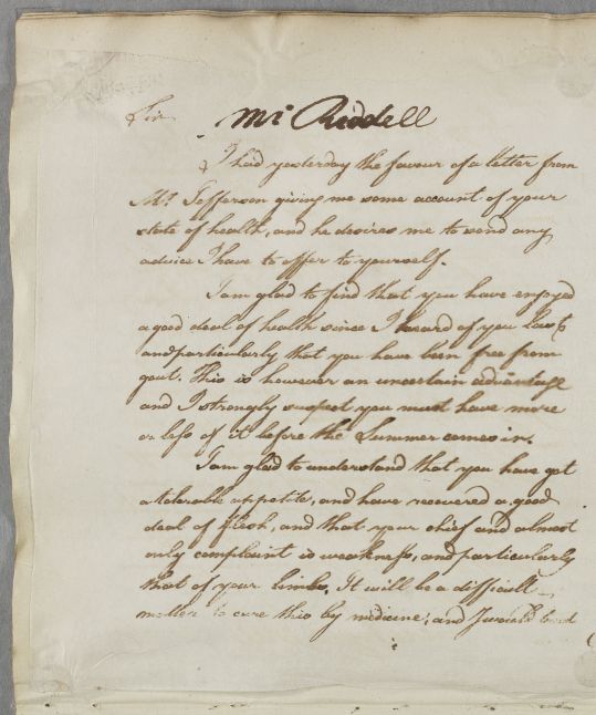 Letter to Mr Riddell concerning his own case, in response to 'a letter from Mr Jefferson giving me some account of your state of health'.