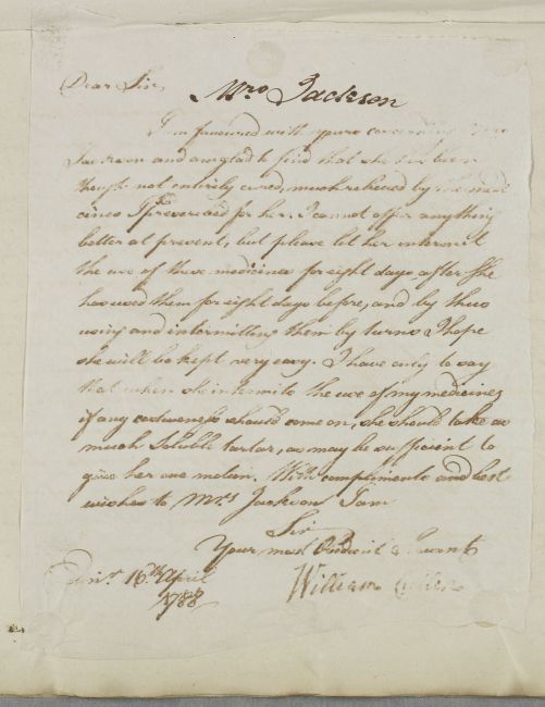 [ID:5628] From: Dr William Cullen (Professor Cullen) / To: Mr I. Creighton (Crighton) / Regarding: Mrs M. Jackson (Patient) / 16 April 1788 / (Outgoing)