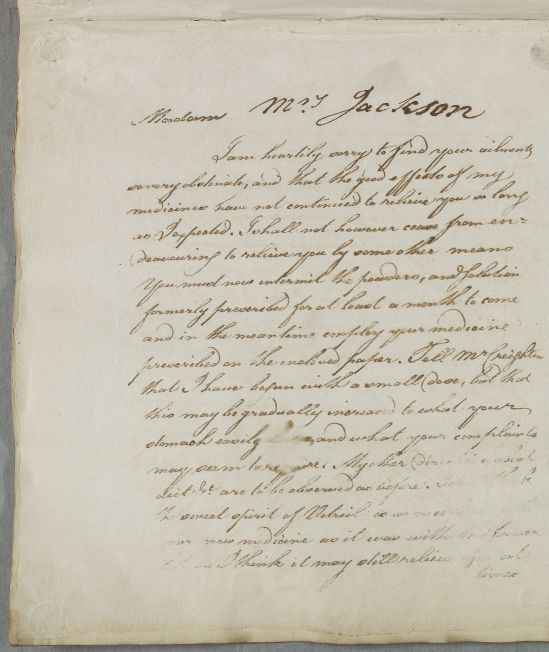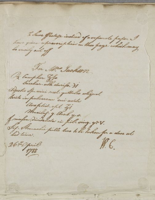 [ID:5637] From: Dr William Cullen (Professor Cullen) / To: Mrs M. Jackson / Regarding: Mrs M. Jackson (Patient) / 26 April 1788 / (Outgoing)