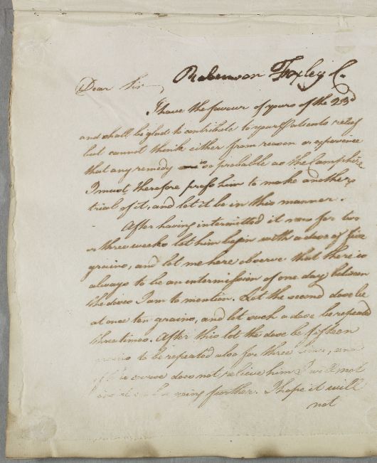 | Summary | Reply to Robinson Foxley, in response to 'yours of the 23d', concerning his unnamed patient, 'the Revd'. Cullen asks that he persevere with the camphor. |