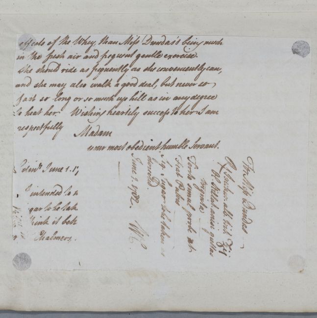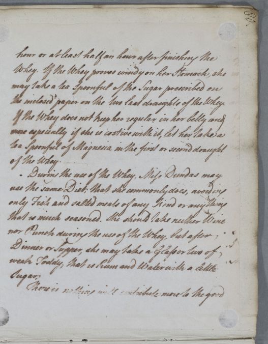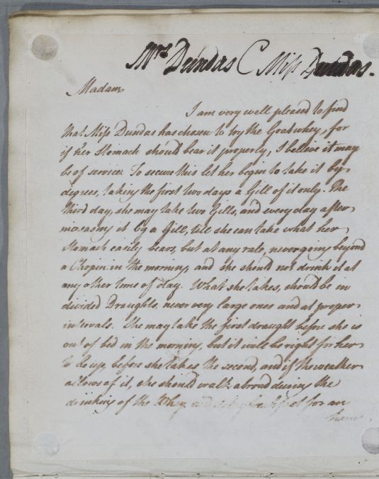| Summary | Reply to Mrs Dundas with instructions for Miss Dundas's diet and goat whey cure, with prescription for a sugar to be taken with it. The postscript is incomplete, due to the positioning of the recipe. |