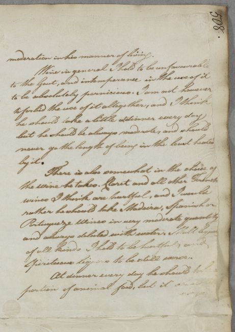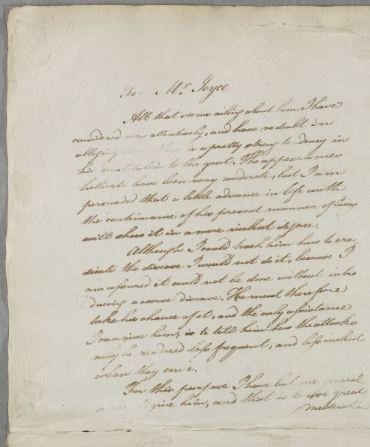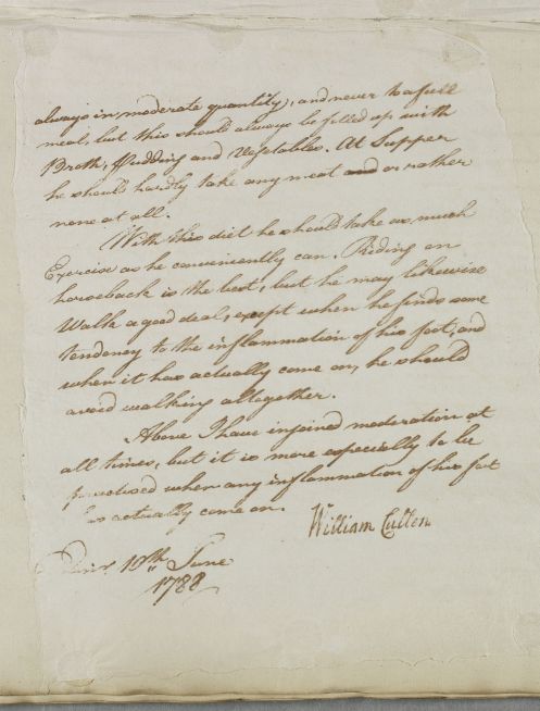 | Summary | Reply headed 'For Mr Joyce'. Since ' there is a pretty strong tendency in his constitution to the gout', Cullen advises moderation and temperance, with advice on diet and exercise. |