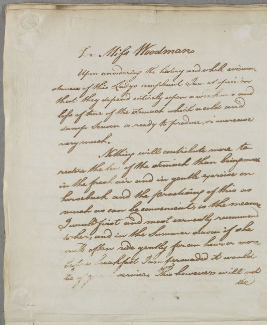 Case of Miss Woodman whose illness is attributed to a weak stomach. |