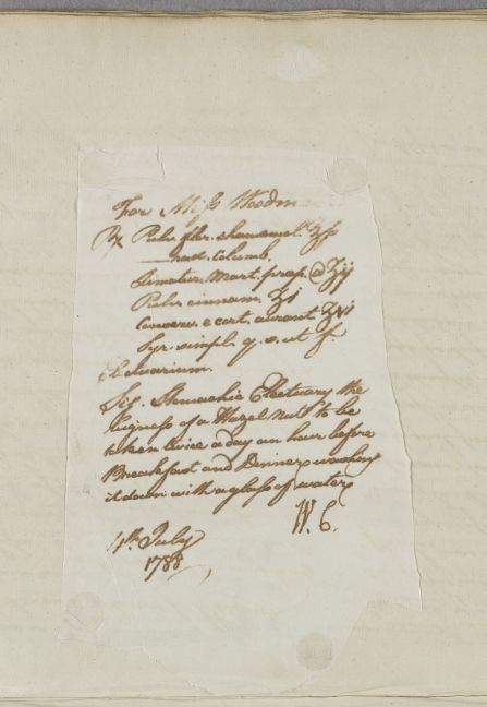 [ID:5682] From: Dr William Cullen (Professor Cullen) / To: [ADDRESSEE UNKNOWN] / Regarding: Miss Woodman (Patient) / 4 July 1788 / (Outgoing)