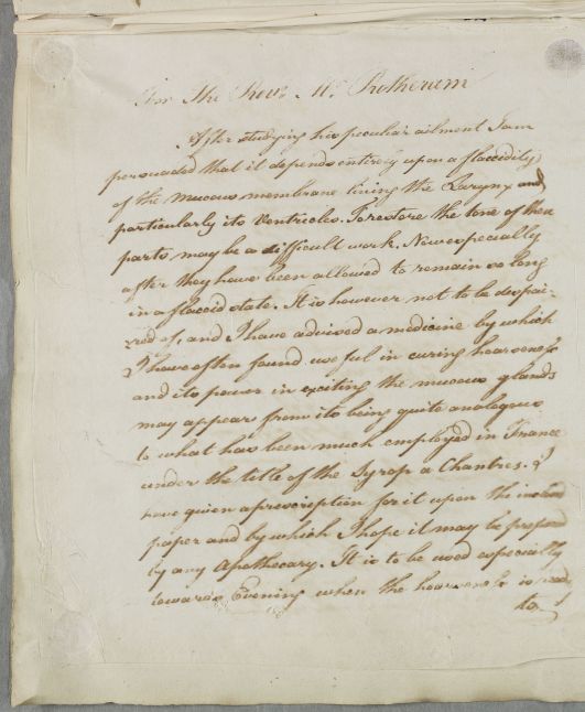 Case of the Revd. Rotheram [Rotherham] who has lost his voice which his friends think is probably from having a small stroke. |