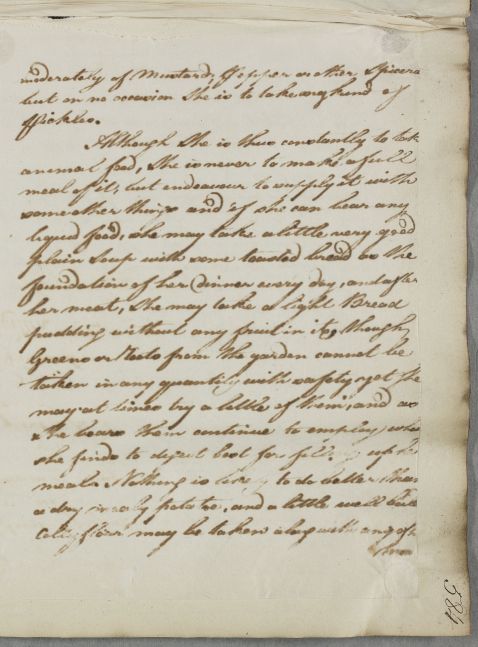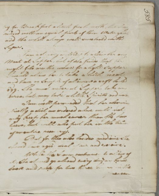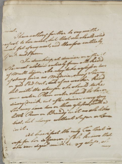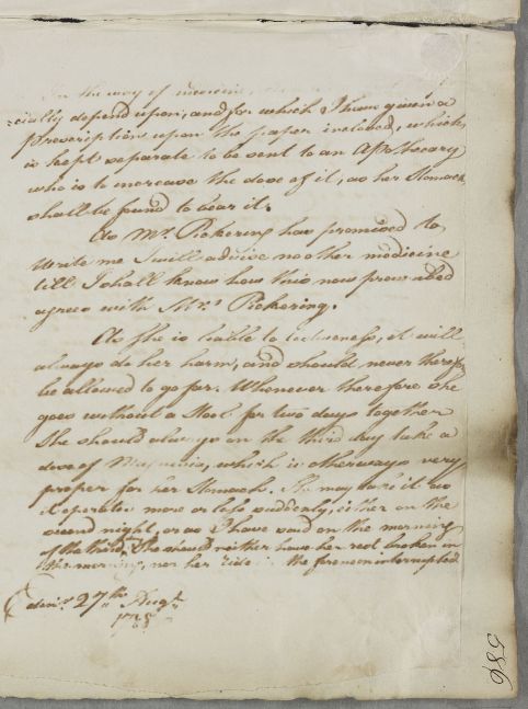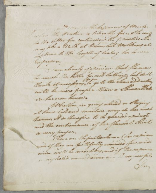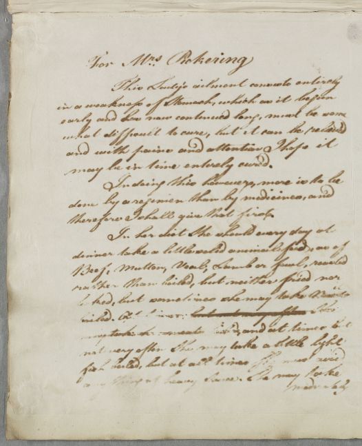 | Summary | Reply headed 'for Mrs Pickering'. Dietary and exercise regimen and prescriptions for a female patient with a weak stomach, which has caused fits (of indigestion) in the night. Cullen thinks the shower bath in her own house preferable to sea bathing. He is expecting to hear from her husband. |