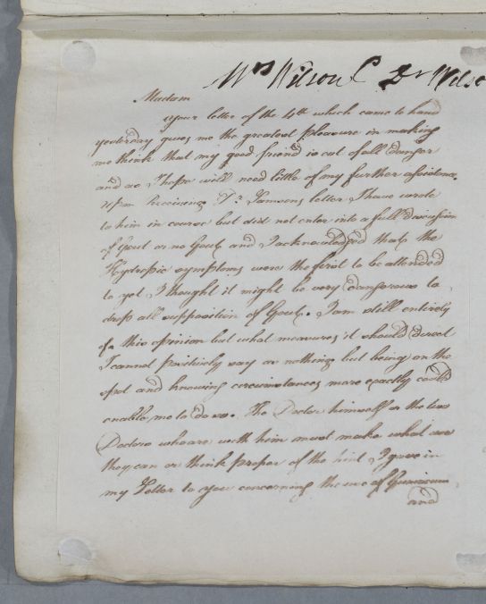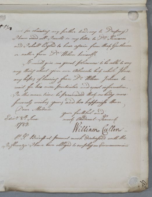 | Summary | Reply, for 'Mrs Wilson C[oncerning] Dr Wilson'. Cullen is still of the opinion that the case is one of gout, and declines to comment on her ailments until he has heard from her husband. Machine scribal copy; a postscript adds 'Being at present much distressed with the Influenza I have been obliged to employ an Emmanuensis'. |