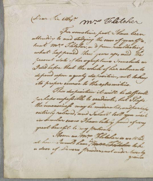 Case of Mrs Fletcher of Bonshaw whose ailments are attributed to a a 'gouty dispotion'. |