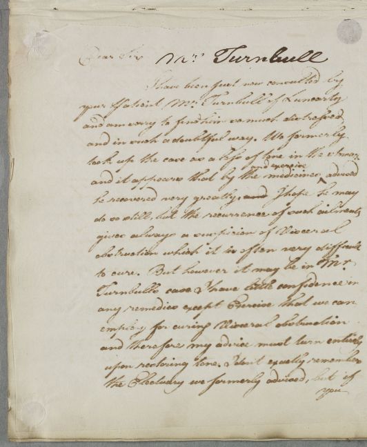 Reply to Dr Colin Roberstone at Perth concerning the case of Mr Turnbull, and mentioning Robertstone's gallstones and jaundice.