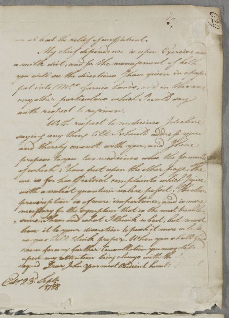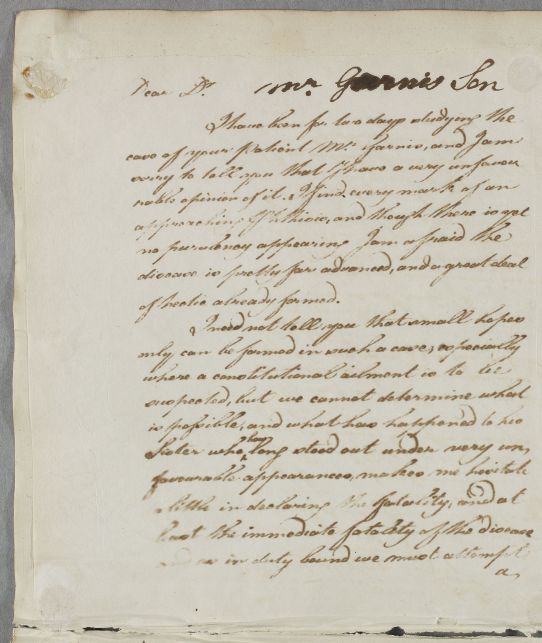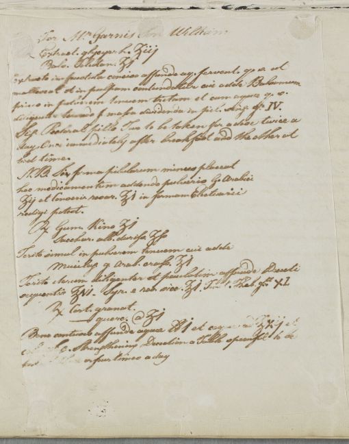 | Summary | Letter to Dr Willison (addressed as 'dear John'), concerning the case of Mr Garnis's son William, in whom he finds 'every mark of an approaching Phthisis'. However, since the patient's sister has 'long stood out under very unfavourable appearances', he hesitates to say it will be soon fatal. He refers to his previous paper having been 'put into Mrs. Garnis hands', and includes prescriptions. |