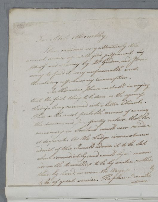 [ID:5734] From: Dr William Cullen (Professor Cullen) / To: [ADDRESSEE UNKNOWN] / Regarding: Miss Abernethie (Abernethy) (Patient) / 2 October 1788 / (Outgoing)