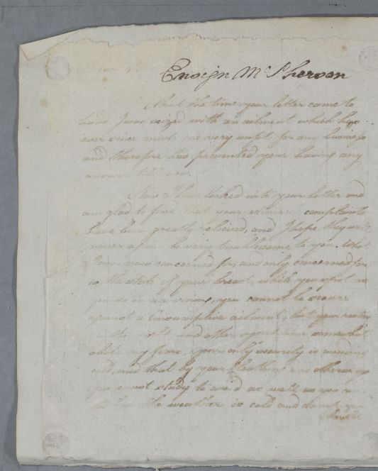 | Summary | Reply to Ensign McPherson concerning his own case. Cullen apologises for delay in replying as he was "seized with an ailment which has ever since made me very unfit for any business". |