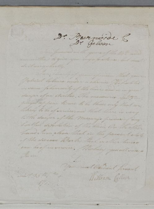 Letter to Dr Burnside concerning the case of Dr Gibson, p.35. Cullen advises on treatment, since 'your Patient labours under a chronic Hepatitis or some Schirrosity of the liver and is in great danger of an Ascites'.