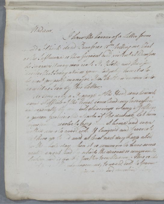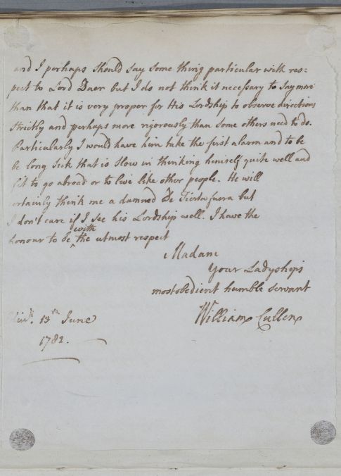 | Summary | Letter to [Lady Selkirk], in which Cullen describes a letter he recieved from Lord Selkirk about an outbreak of influenza in Dumfries which may soon reach St Mary's Isle, and gives his own instructions on how to manage it. |