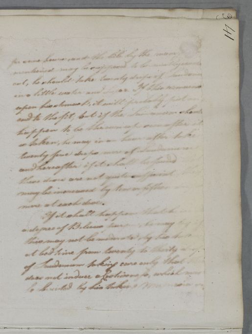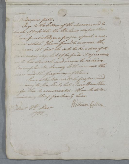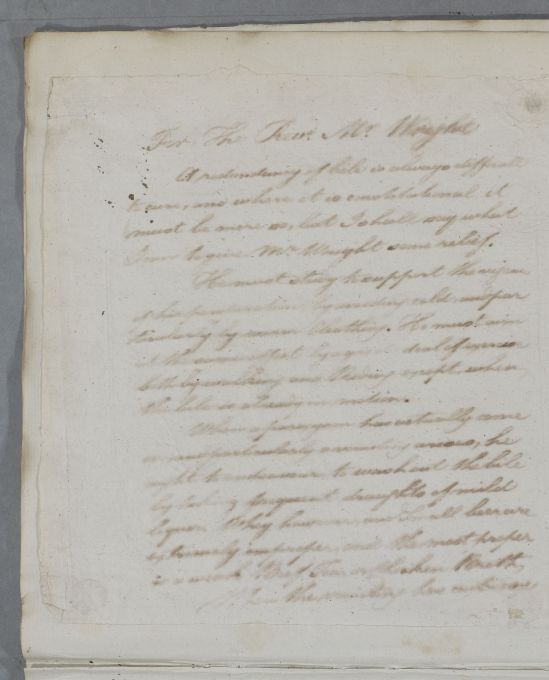 | Summary | Reply headed 'For the Revd. Mr. Wright'. Cullen believes he is suffering from 'a redundancy of bile', which may be difficult to cure. He gives advice on treatment and diet, and a prescription for strengthening powders. |