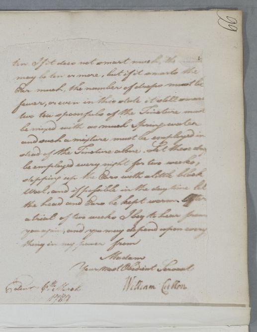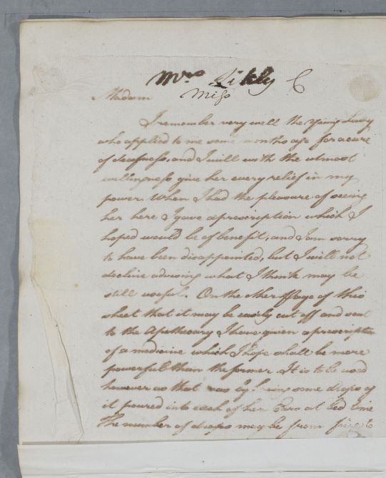 | Summary | Reply to Mrs Likly concerning 'the young Lady who applied to me some months ago for a cure of deafness'. |