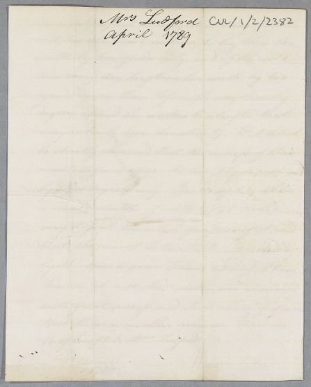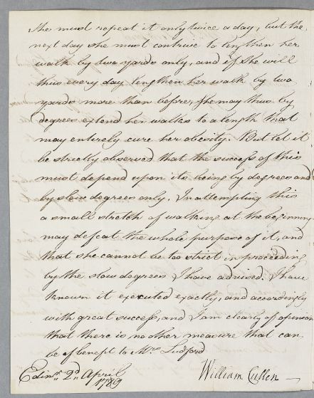 | Summary | Letter by Cullen, 'For Mrs. Ludford', probably to her son, medical student Jonathan Ludford. He advises gradual bodily exercise to cure her obesity. Either a retained fair copy or the unposted original letter; [DOC ID:5806] is the casebook copy. |