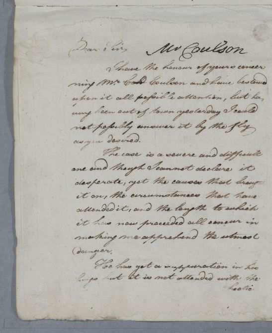 [ID:5808] From: Dr William Cullen (Professor Cullen) / To: Dr John Clark (Clerke, Clarke) / Regarding: Mr Coulson (Patient) / 11 April 1789 / (Outgoing)