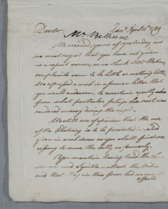 [ID:5809] From: Dr Henry Cullen (Harry, Dr Henry, "the young doctor" ) / To: Mr John Goodsir / Regarding: Mr John Bethune (Lindsay) (Lindsay of Wormiston; after 1782, Bethune of Kilconquhar/Balfour) (Patient) / 11 April 1789 / (Outgoing)
