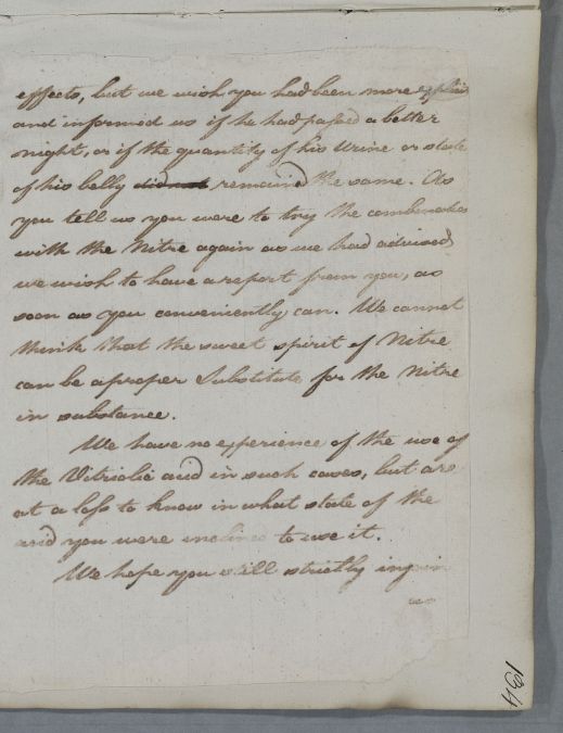 | Summary | Reply for 'Mr. Bethune' to John Goodsir, from Henry Cullen on behalf of himself and his father. The use of the electuary is to be continued, but the Cullens require further information to advise more fully on medicines. |