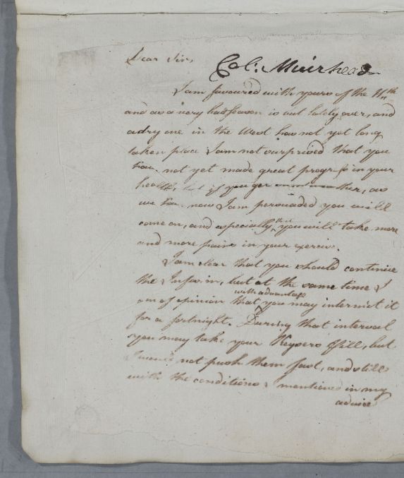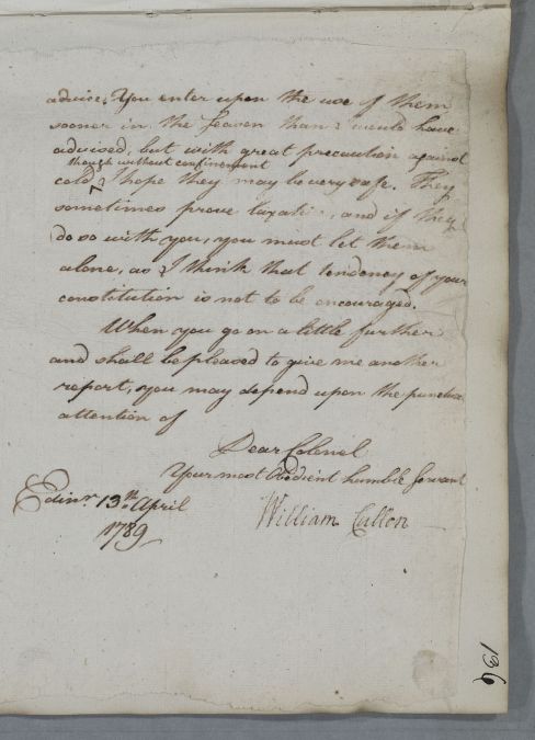 [ID:5810] From: Dr William Cullen (Professor Cullen) / To: Colonel D Muirhead / Regarding: Colonel D Muirhead (Patient) / 13 April 1789 / (Outgoing)