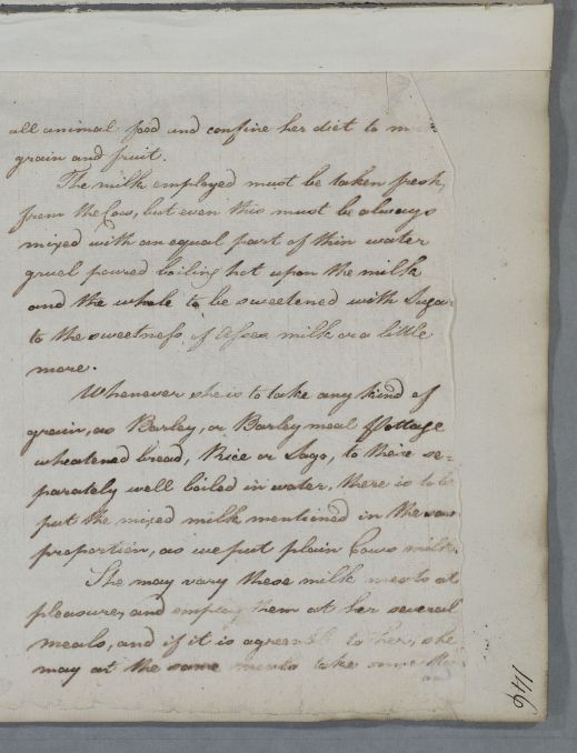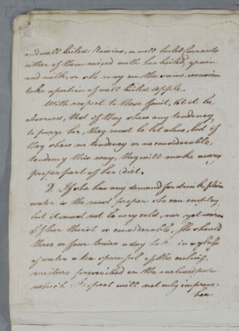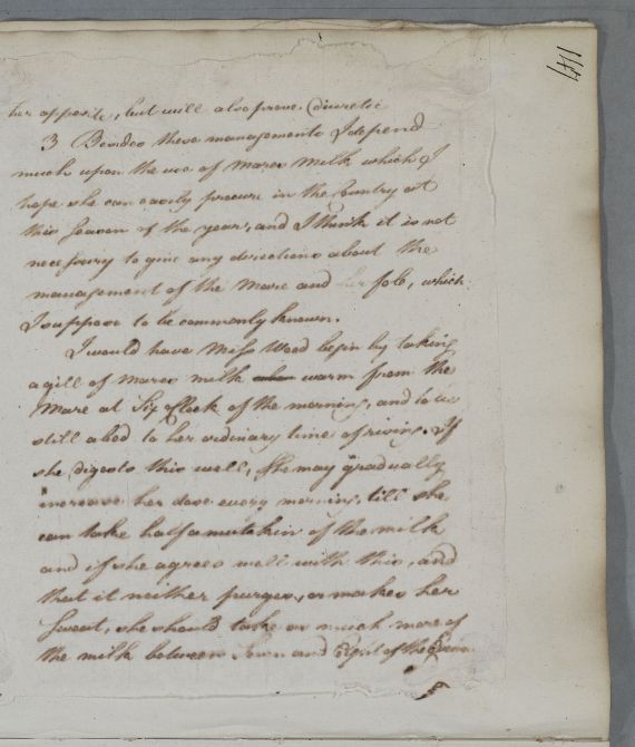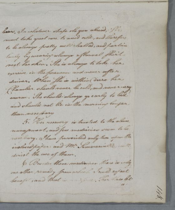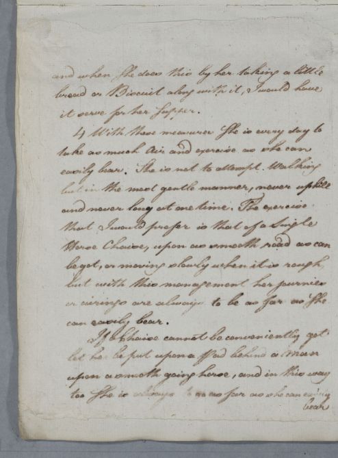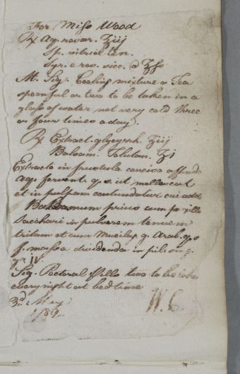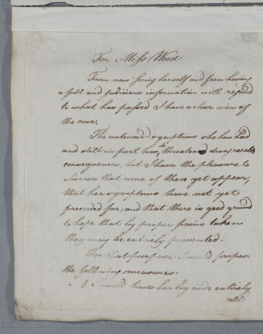 Reply headed 'For Miss Wood', after her visit to Cullen (either the same or the previous day), and probably addressed and given to her father. Cullen provides a regimen, including advice on taking mare's milk, and a perpetual issue on the breast.
