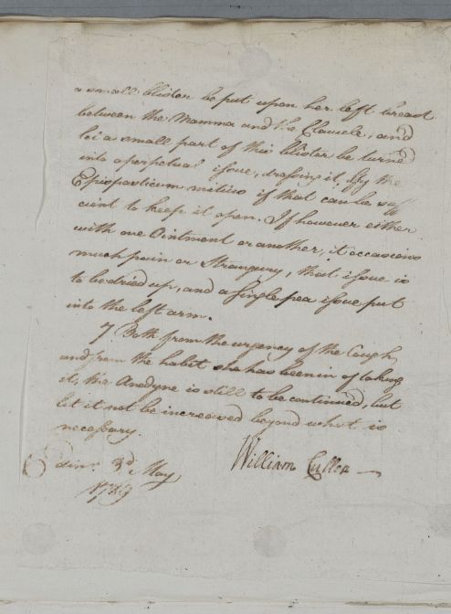 | Summary | Reply headed 'For Miss Wood', after her visit to Cullen (either the same or the previous day), and probably addressed and given to her father. Cullen provides a regimen, including advice on taking mare's milk, and a perpetual issue on the breast. |