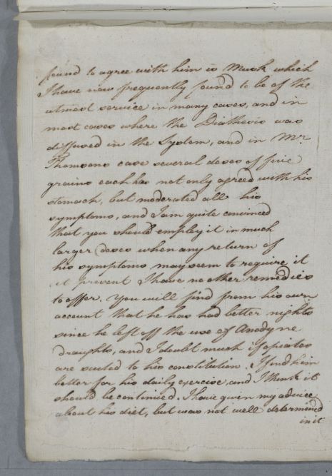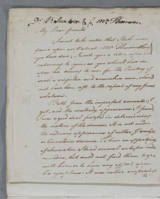 | Summary | Relpy to Dr Robertson and colleagues, concerning the case of Mr Thomson, who has been to consult Cullen in person. Cullen chides them for leaving so much of the case to Mrs Thomson's narration: 'the History of such a singular and anomalous case, should not have been left to the report of any female whatever'. He concludes that the case is based on a gouty diathesis, and recommends the use of musk. |