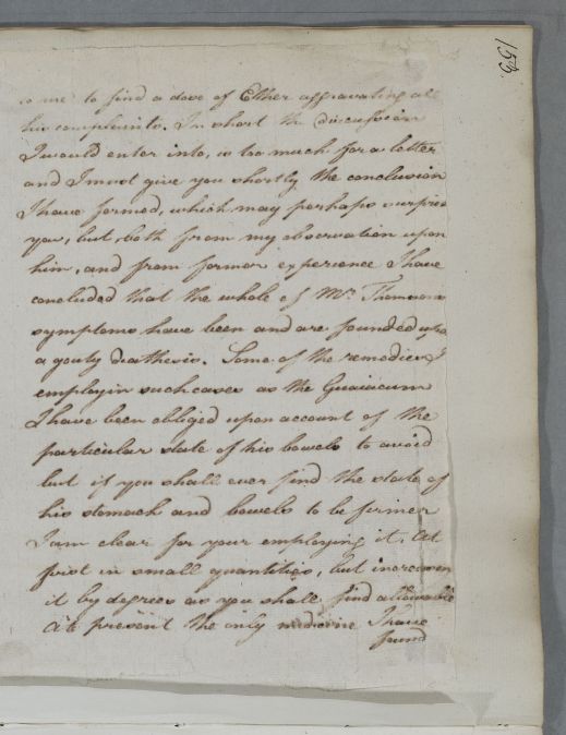 Relpy to Dr Robertson and colleagues, concerning the case of Mr Thomson, who has been to consult Cullen in person. Cullen chides them for leaving so much of the case to Mrs Thomson's narration: 'the History of such a singular and anomalous case, should not have been left to the report of any female whatever'. He concludes that the case is based on a gouty diathesis, and recommends the use of musk.