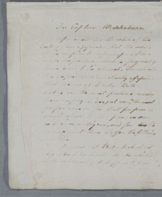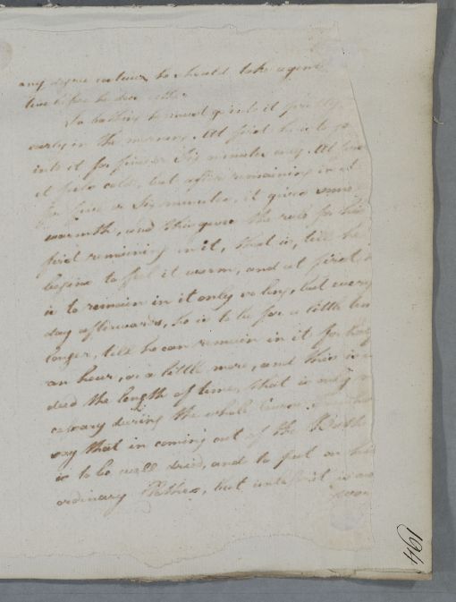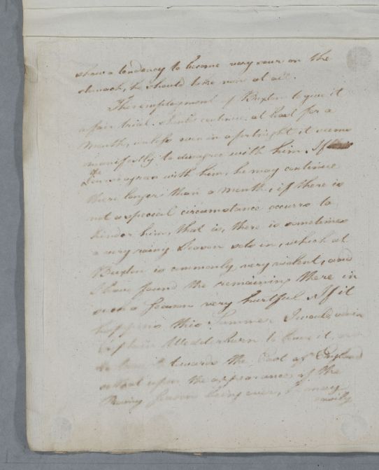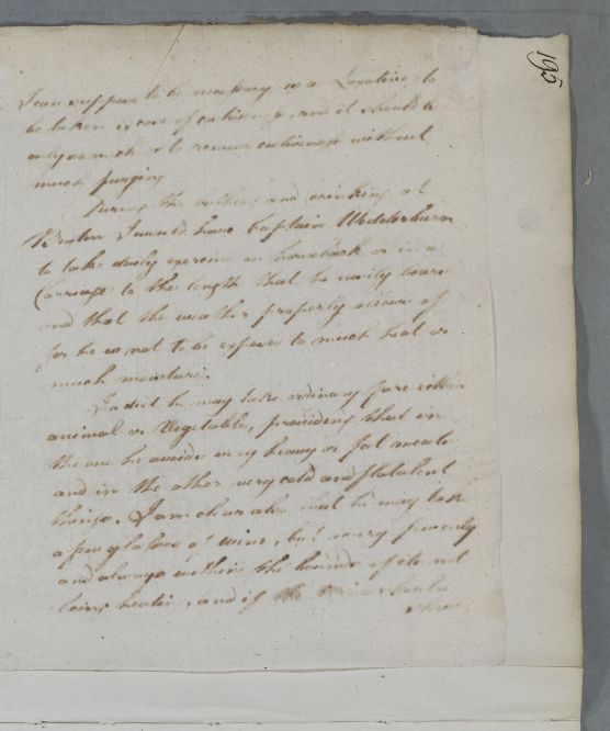 | Summary | Reply headed 'For Captain Wedderburn'. Poor Copy. See letter 5822 where the text of the letter is almost identical (it was instructions to Capt Wedderburn's friend Capt Scott (Case 2365) - "In bathing he must go into it pretty .." down to "necessity may seem to require", "during the bathing & drinking" down to "take a few glasses of wine" and the paragraph referring to travelling to East England. Transcriber used this letter to identify problem text within the poor copy. |