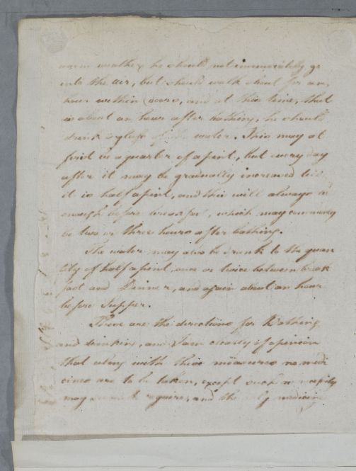Reply headed 'For Captain Wedderburn'. Poor Copy. See letter 5822 where the text of the letter is almost identical (it was instructions to Capt Wedderburn's friend Capt Scott (Case 2365) - "In bathing he must go into it pretty .." down to "necessity may seem to require", "during the bathing & drinking" down to "take a few glasses of wine" and the paragraph referring to travelling to East England. Transcriber used this letter to identify problem text within the poor copy.