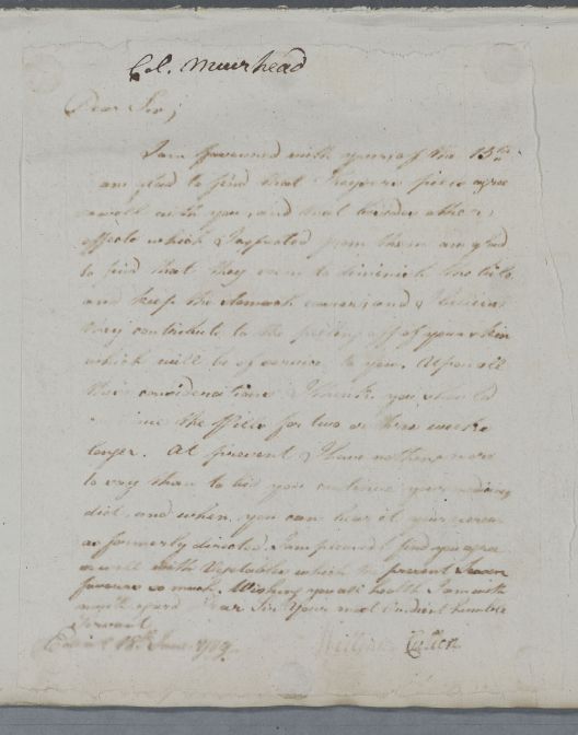 [ID:5836] From: Dr William Cullen (Professor Cullen) / To: Colonel D Muirhead / Regarding: Colonel D Muirhead (Patient), Miss Muirhead(?) (Patient) / 18 June 1789 / (Outgoing)