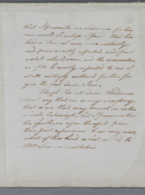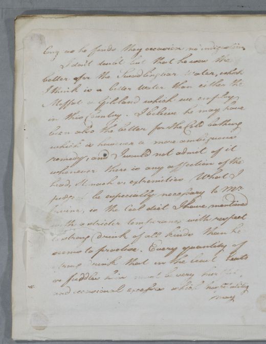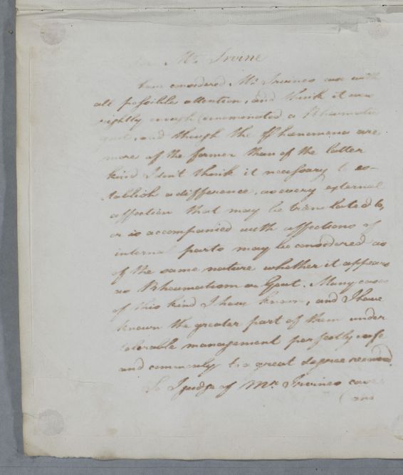 | Summary | Reply headed 'For Mr Irvine', replying to Andrew Todd's letter (dated Edinburgh 6 July) about his patient in Ireland. Cullen agrees with Todd's diagnosis of rheumatic gout, and approves of his treatment, with suggestions for an antiphlogistic course. He regards the Swadlingbar water as superior to Moffat or Gilsland in such a case. |
