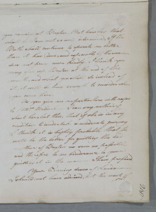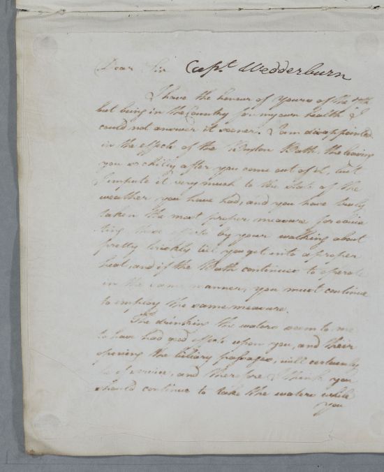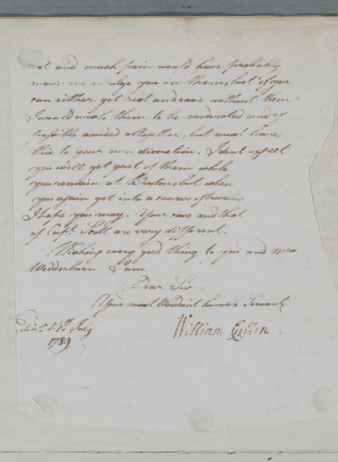 | Summary | Reply to Captain Wedderburn concerning his own case, in response to 'yours of the 7th'. Cullen was delayed in answering letter due to "being in the Country for my own health". |