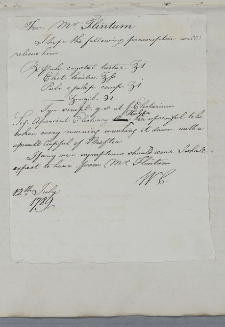 | Summary | Reply headed 'For Mr Flintum'. Aperient prescription given to the patient when he visited Edinburgh in July 1789. |