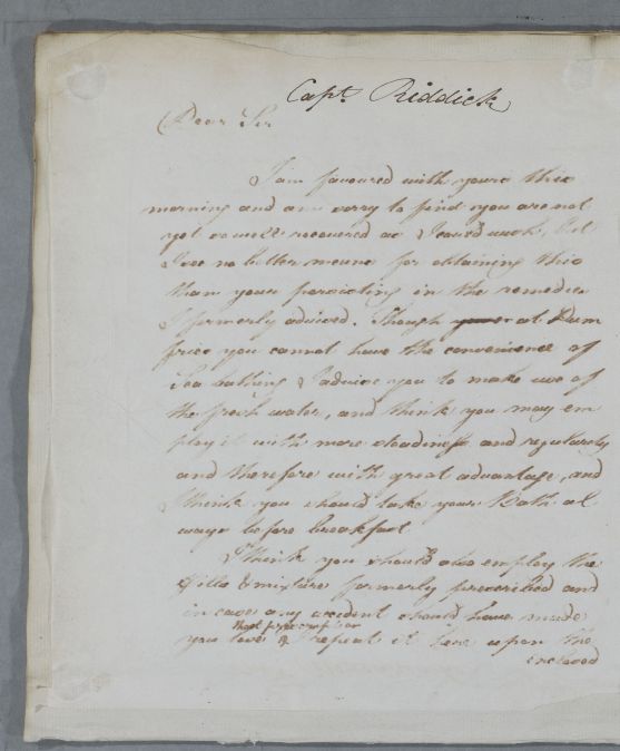 [ID:5868] From: Dr William Cullen (Professor Cullen) / To: Captain William Riddick / Regarding: Captain William Riddick (Patient) / 5 August 1789 / (Outgoing)