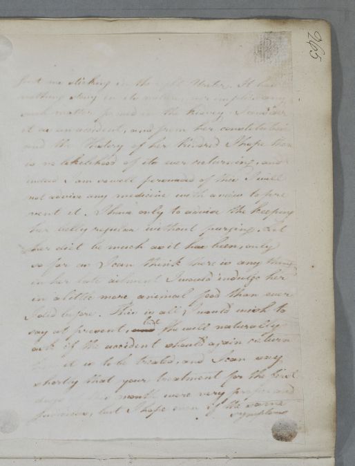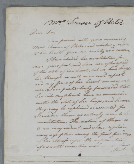 Reply, for 'Mrs Fraser of Relic'. Cullen believes Mrs Fraser's illness to be based upon 'the supposition of a small concretion', a sample of which Roberston enclosed in his last letter.