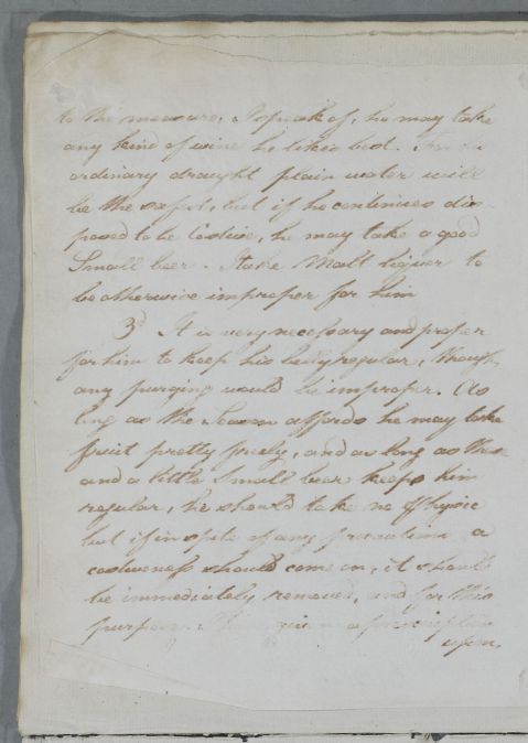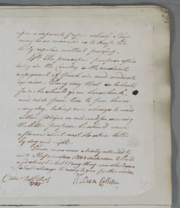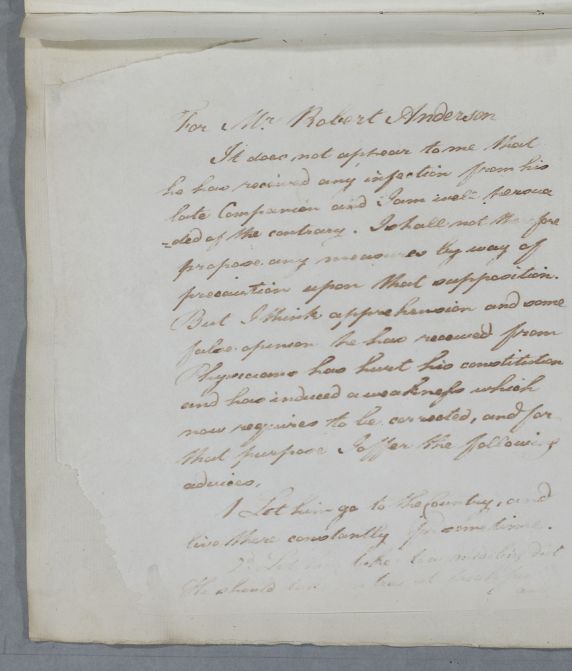 | Summary | Reply headed 'For Mr Robert Anderson'. Cullen does not believe that his condition is venereal: 'It does not appear to me that he has received any infection from his late Companion and I am well persuaded of the contrary'. He gives advice on diet and exercise, and wearing a flannel shirt. The enclosure of an aperient prescription is mentioned, but it appears to be missing. |