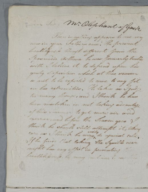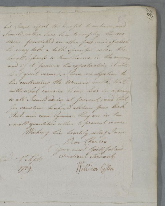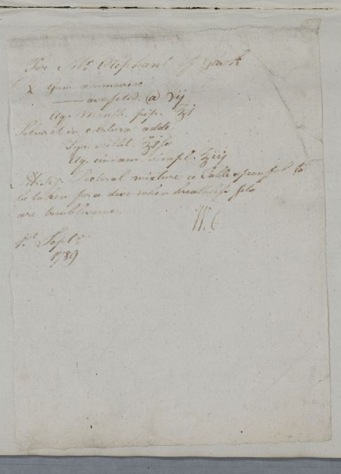 [ID:5884] From: Dr William Cullen (Professor Cullen) / To: Mr Charles Oliphant / Regarding: Mr Laurence Oliphant (of Gask) (Patient) / 1 September 1789 / (Outgoing)