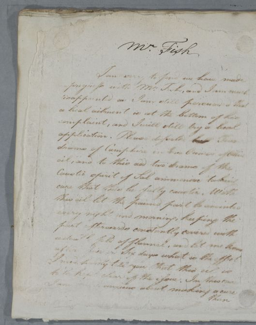 | Summary | Reply [to Dr Taylor)] concerning the case of Mr Fish. Cullen apologises for a slight delay in his response as 'I was yesterday engaged in a Public examination'. The prescription is given in English in the text of the letter. |