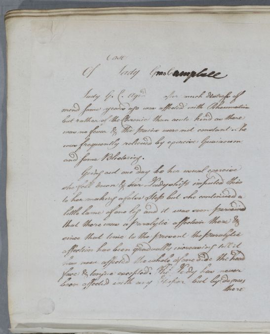 | Summary | Reply headed, 'Case of Lady G__ C___', amended to 'Grace Campbell' by a later hand. She had suffered from rheumatism, which grew worse after an injury to her leg; the leg became partially paralysed, and the paralysis spread to the whole of one side of her body, except her face. She also suffered from 'fits of violent head-ach' during the night. Blistering has helped partially, as has electricity. |