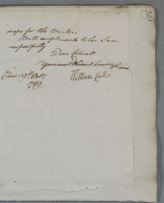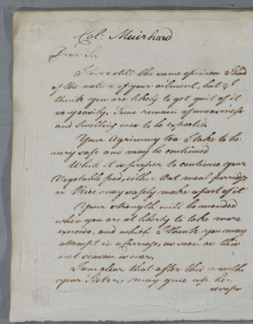 [ID:5902] From: Dr William Cullen (Professor Cullen) / To: Colonel D Muirhead / Regarding: Colonel D Muirhead (Patient), Miss Muirhead(?) (Patient) / 9 October 1789 / (Outgoing)