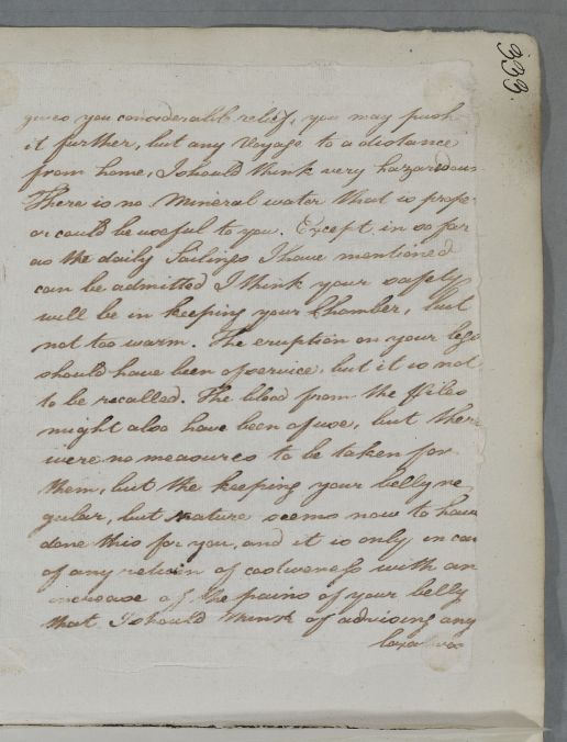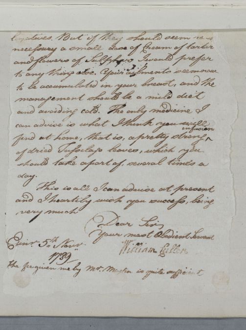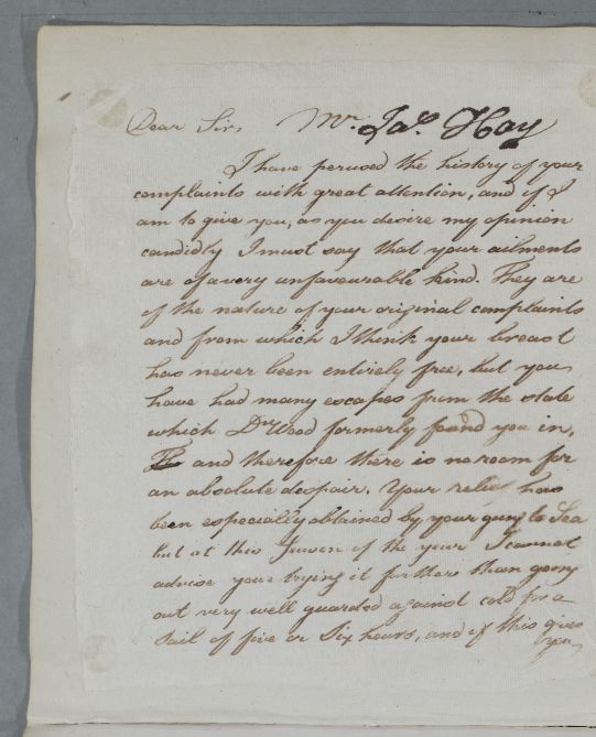 | Summary | Reply, 'Mr Jas. Hay'. Cullen advises against going to sea at this season, and recommends keeping warm, with the use of laxatives for his piles and tussilago for his breast complaint. |