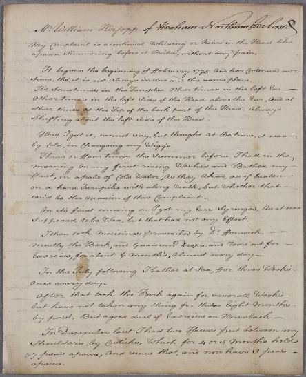 Letter from Mr William Kirsopp of Hexham concerning his own case, 'a continual whising or Noise in the Head like a pann simmering before it Boiles'. assumed to be an authorial original because of the first-person voice and the distinctive handwriting, but there's no wrapper and from the folds (vertical only ) it does not appear to have been folded so as to be sealed and sent (so likely to have been hand-delivered).