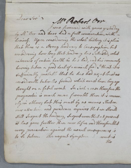 Reply, for 'Mr Robert Orr'. Letter regarding Mr Robert Orr, in whom Cullen diagnoses 'a strong tendency to Consumption'. He suggests purgatives, exercise, and a 'cooling mixture'. He gives advice on how to prepare Tussilago.
