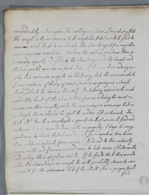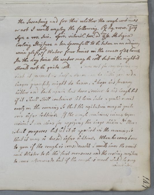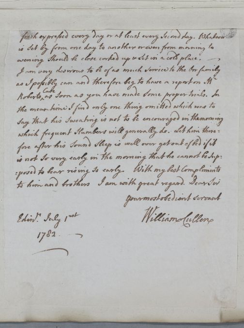 | Summary | Reply, for 'Mr Robert Orr'. Letter regarding Mr Robert Orr, in whom Cullen diagnoses 'a strong tendency to Consumption'. He suggests purgatives, exercise, and a 'cooling mixture'. He gives advice on how to prepare Tussilago. |