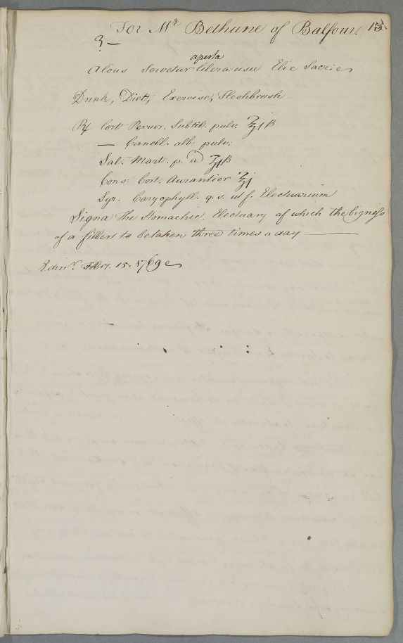 [ID:5950] From: Dr William Cullen (Professor Cullen) / To: [ADDRESSEE UNKNOWN] / Regarding: Mr David Bethune (of Kilconquhar; of Balfour) (Patient) / 15 February 1769 / (Outgoing)
