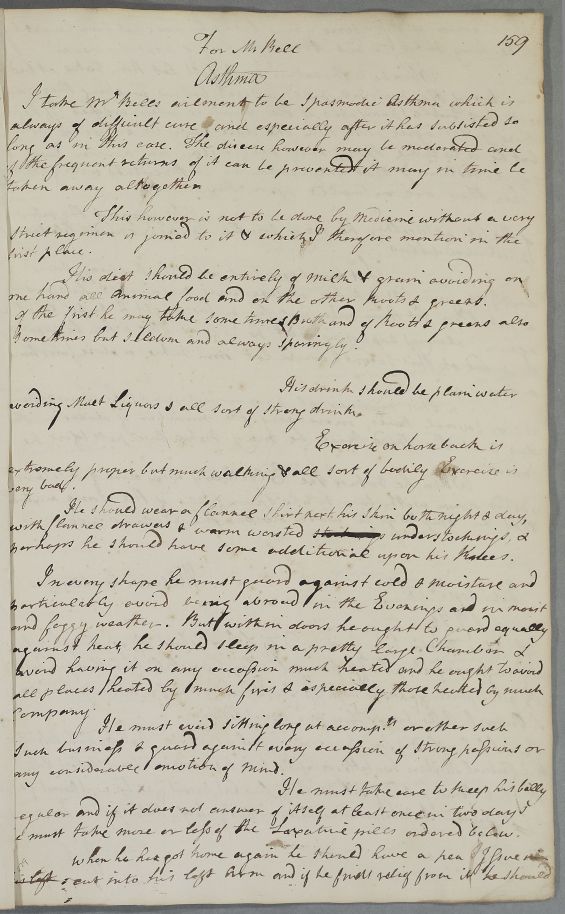 | Summary | Reply headed 'For Mr Bell' diagnosing 'spasmodic asthma', setting out a regimen and prescribing three recipes. |